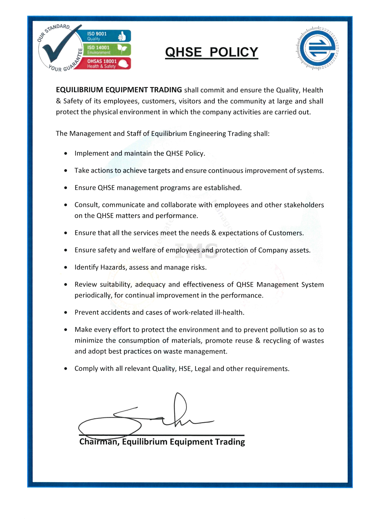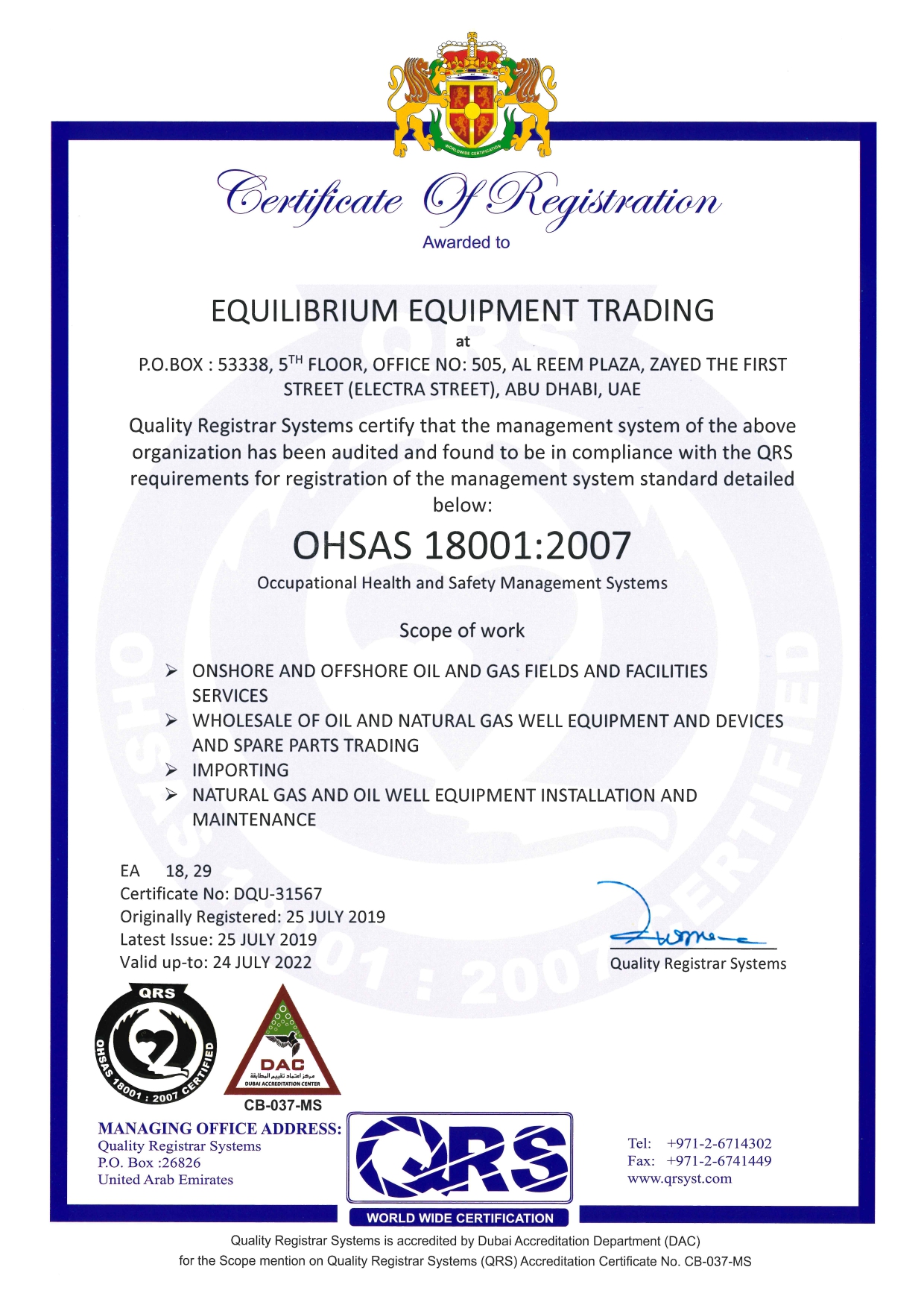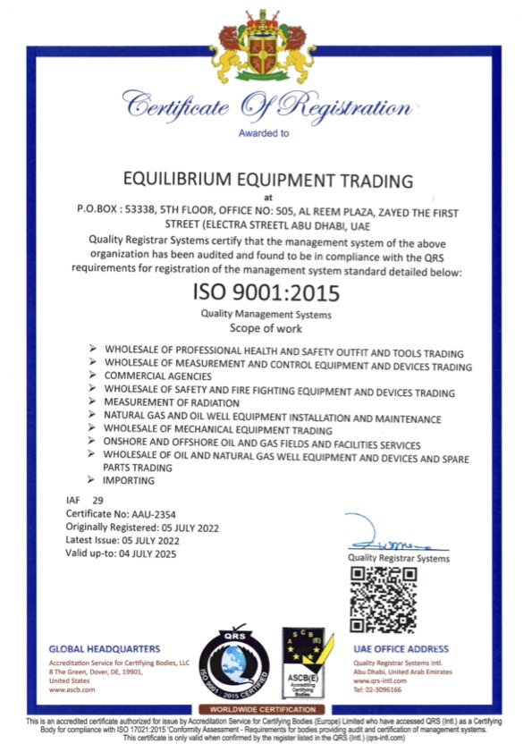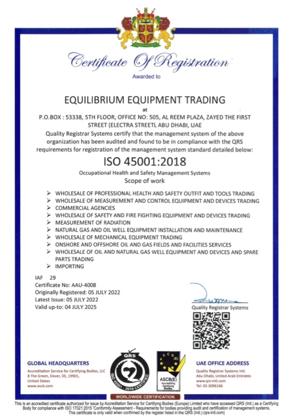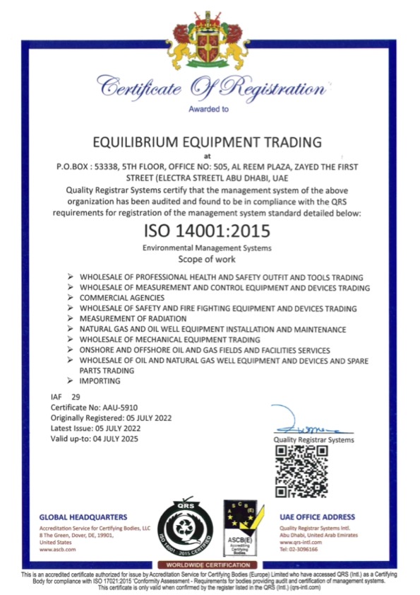 Equilibrium Equipment Trading is an ISO 9001:2015, ISO 14001:2015, and ISO 45001:2018 Certified Company for Quality, Environmental, and Health & Safety Management